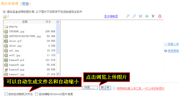点击“浏览上传图片,左下角可以选择“自动生成随机文件名”和“自动缩小为100*100比例”。右上角可以对图片进行放大缩小显示最合适比例删除清空等操作。